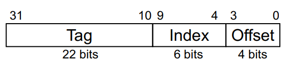 - Cache: 64 blocks (--> 64개의 block을 구분하기 위해서는 6 bits가 필요함)