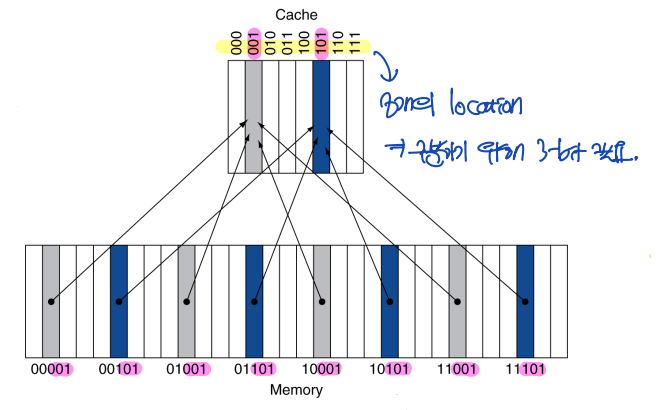 : Memory 하위 3-bit와 같은 주소를 가지는 cache memory로 addressing된다.