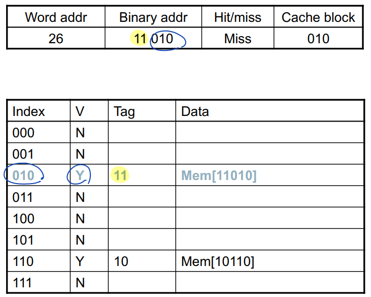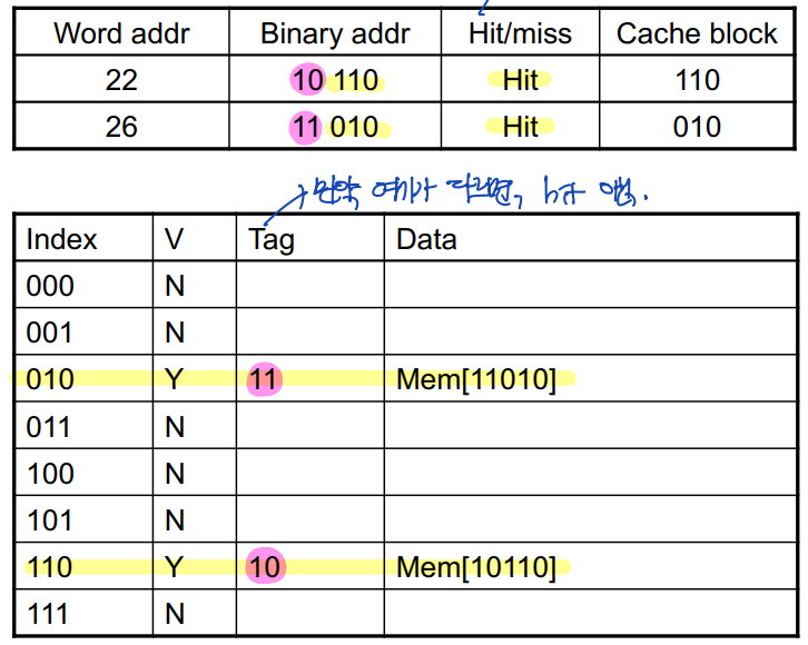 - Cache: 8 blocks (--> 8개의 block을 구분하기 위해서는 3 bits가 필요함)
