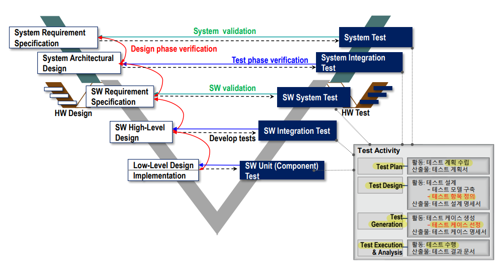 - Review: 각 단계마다의 산출물을 검토한다. --> Static test