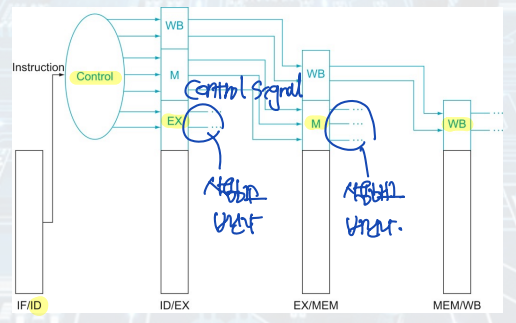 : ID 단계에서 control signal을 생성해서, pipeline register를 통해 뒤의 단계로 전달한다.