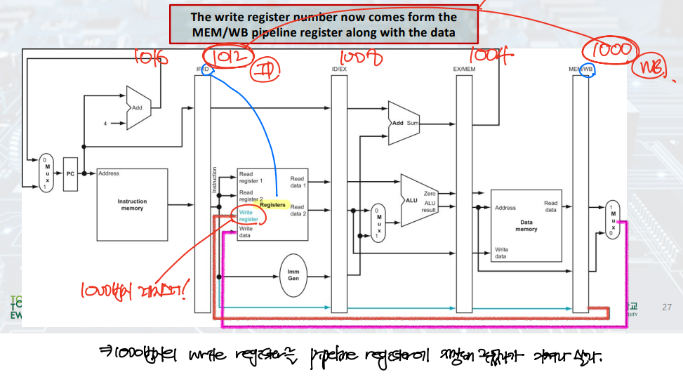 - ID 단계에서의 Write data: 1000번지 instruction의 Write data이다...
