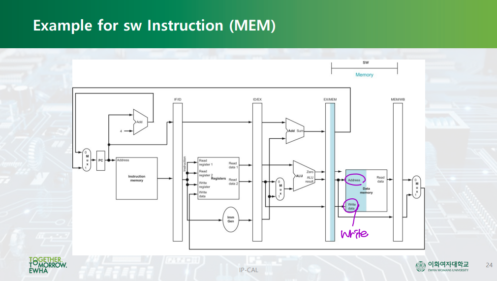 - EX/MEM pipeline register에 저장된 메모리 Address값 읽어와서, 해당 메모리에 Write data를 쓴다.