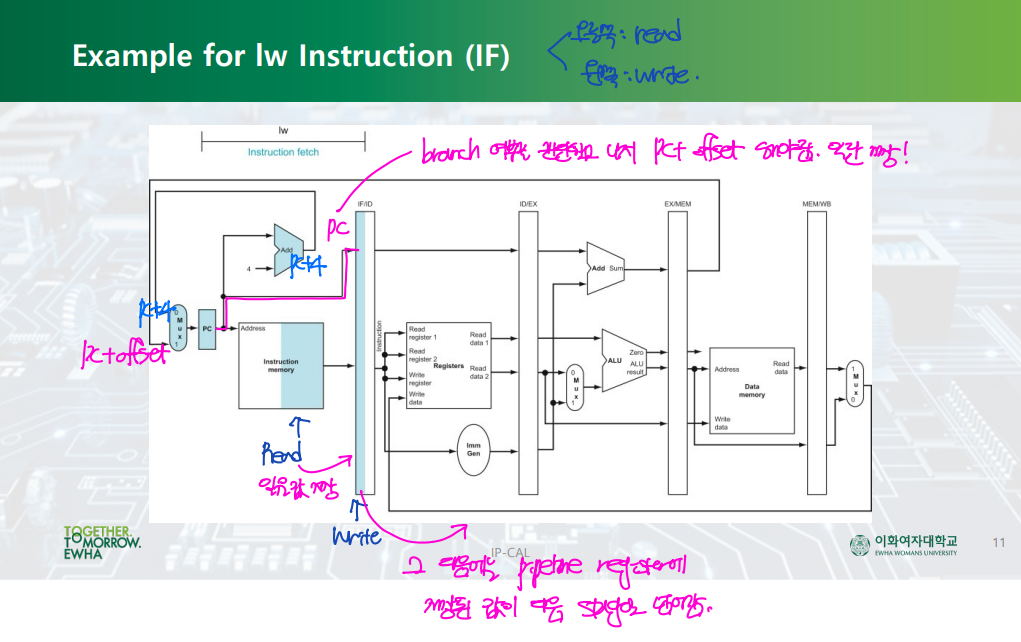 - Branch (o) --> (PC+4) + offset - Data Hazard: Register file에서 서로 다른 instruction에 대한 WB과 ID가 동시에 일어나기 때문에 발생한다.