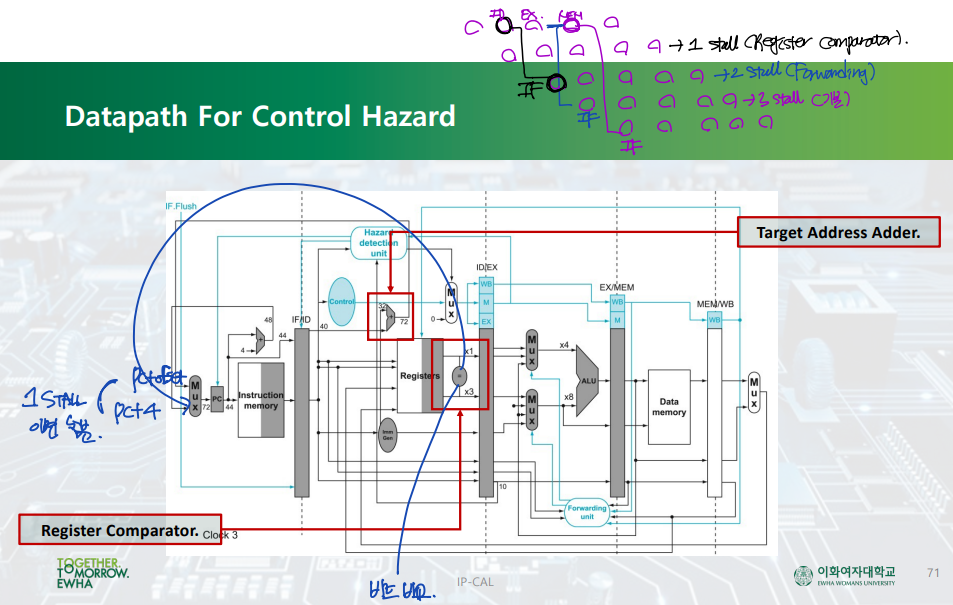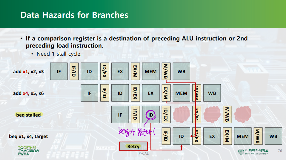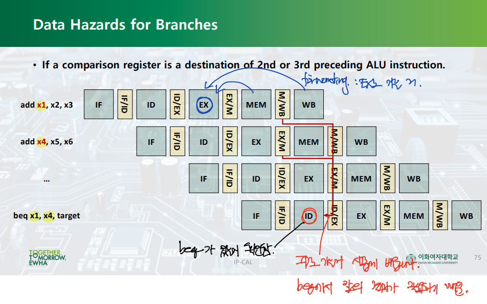 --> beq instruction 다음에 어떤 연산을 수행해야 할 지, 따라서 어떤 PC 값을 설정해야 할 지( PC+4 또는 PC+offset)를 알기 위해서는 3 STALL이 발생한다.