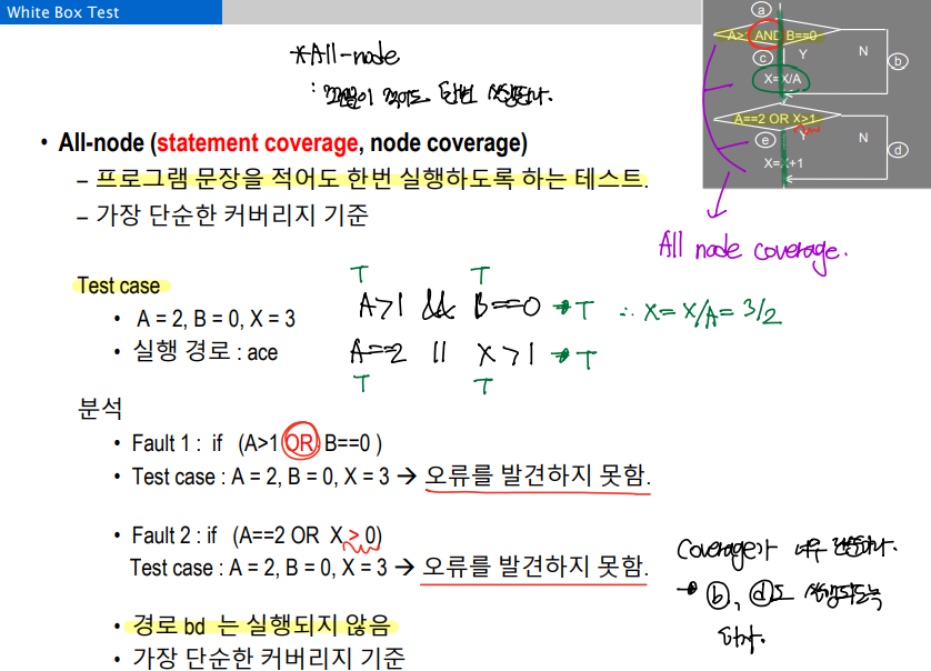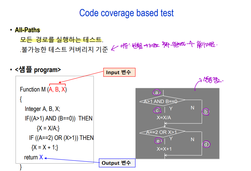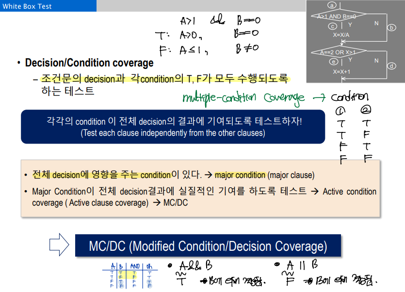 - Condition/Decision coverage: 모든 condition에 대해 T/F, 모든 decision에 대해 T/F