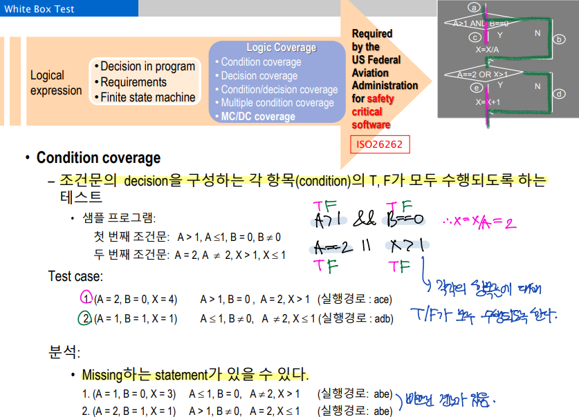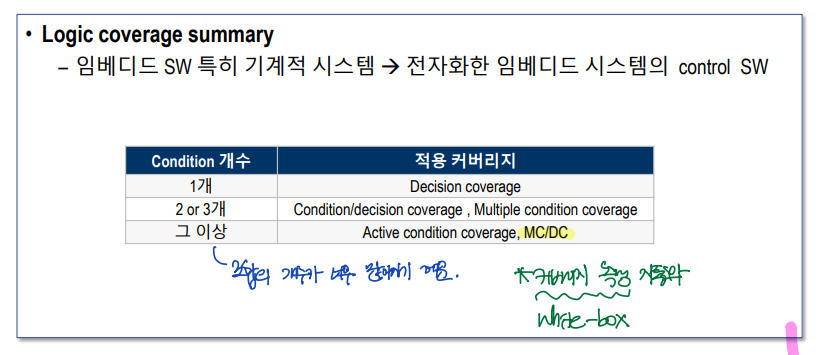 - Decision/Condition coverage --> MC/DC(Modified Condition/Decision Coverage)