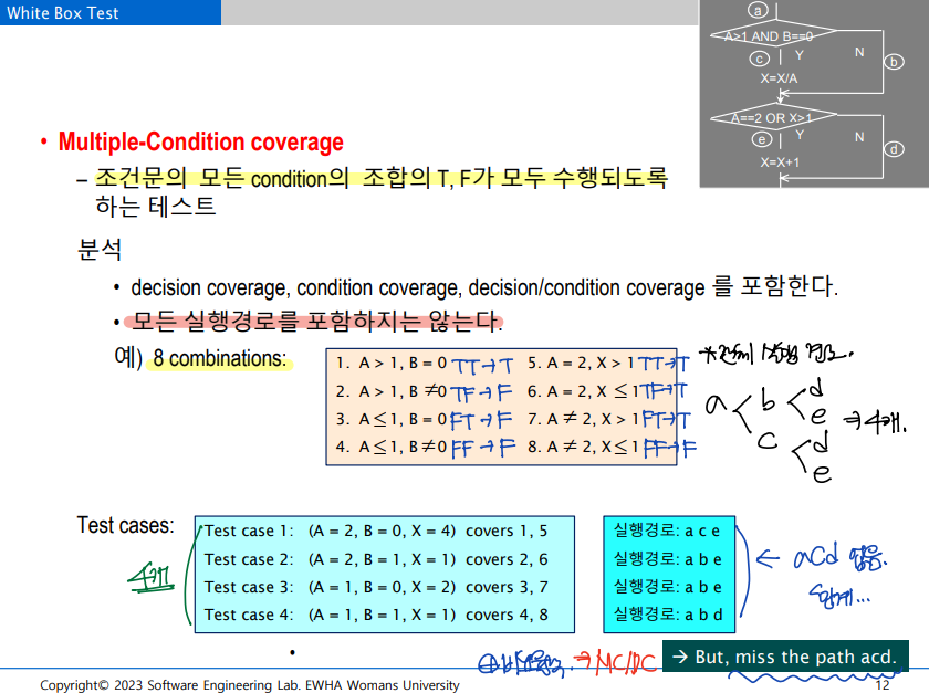 - 모든 condition에 대해 커버하기는 하지만, 조건문1과 조건문2를 어떻게 조합하여 4개의 테스트 케이스를 만드느냐에 따라, 모든 실행경로를 포함하지 않을 수 있다.