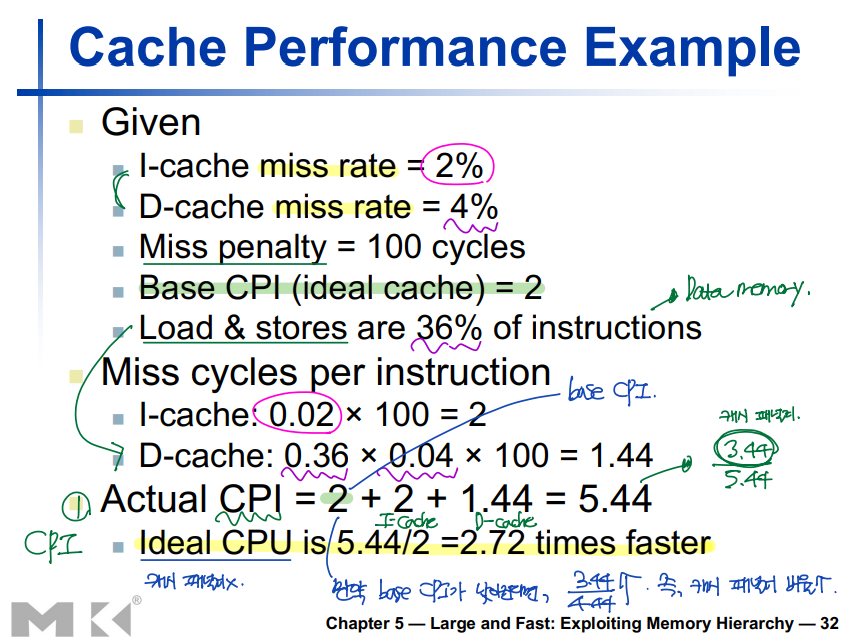 ▶ Actual CPI = base CPI + I-cache miss cycles + D-cache miss cycles