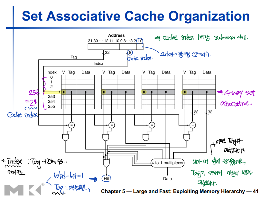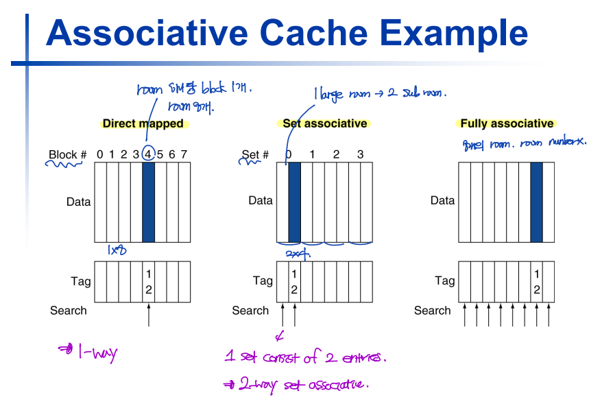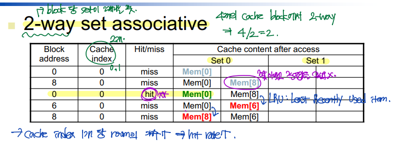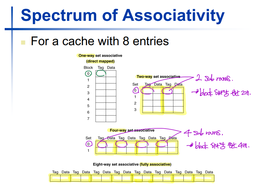 - Set associative cache: 하나의 cache index 당 room(sub-room)이 여러개다.