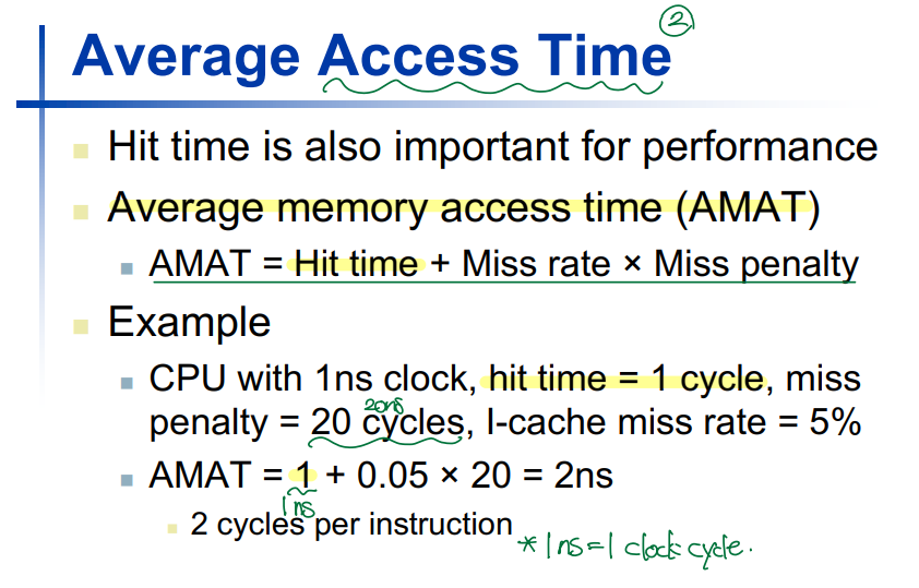 ▶ AMAT(Average Memory Access Time) = Hit time + Miss rate * Miss penalty
