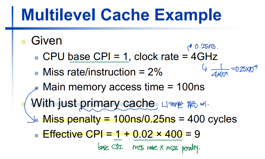: Cache miss가 발생하면, 메모리 접근 시에 많은 시간 즉, 많은 clock cycle이 소요된다.