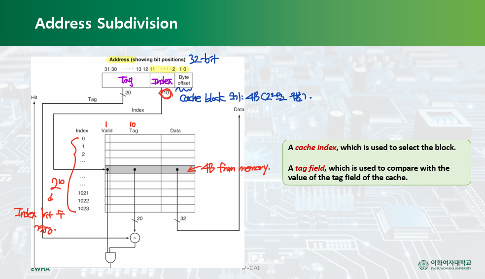 - Index: 총 캐시 주소가 2^10개이기 때문에, 주소를 구분하기 위해 10-bit가 필요하다.