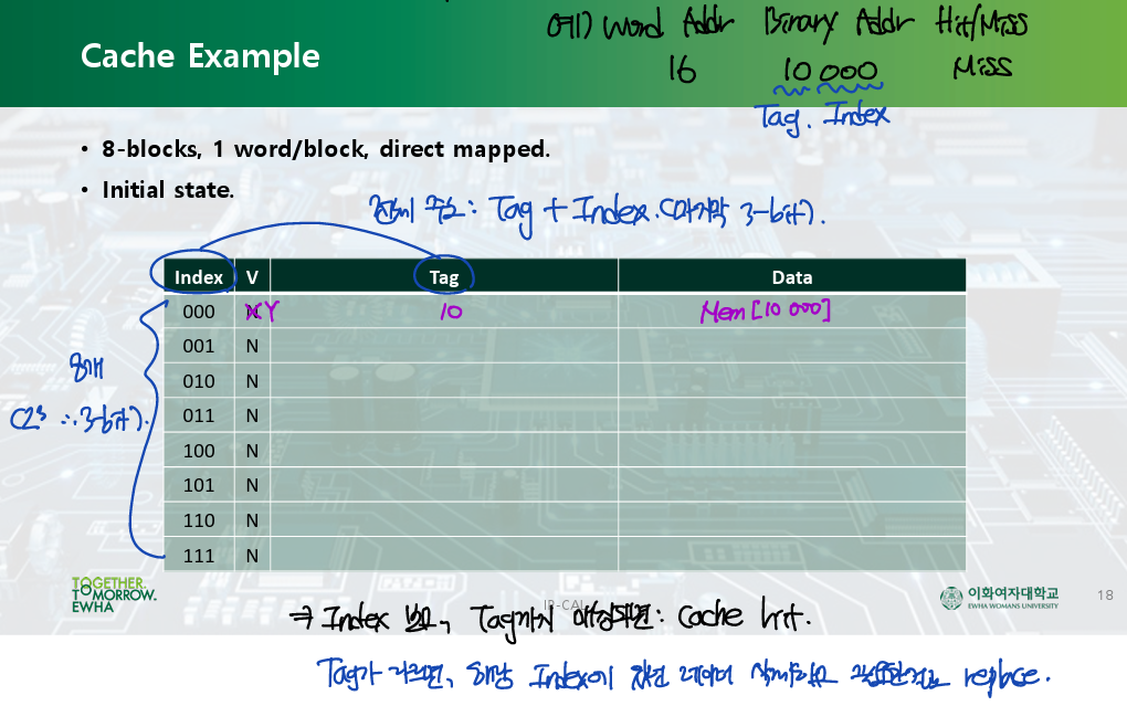 - Tag: 하위 3-bit 이외의 나머지 비트 --> 하나의 Cache entry에서 각각의 Memory entry를 구분한다.