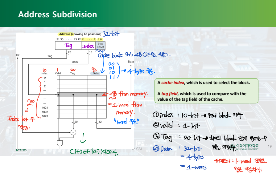 - Index (10 bits): "몇 번째 cache block인가?"