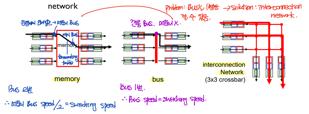 따라서 이에 대한 해결책으로 제시된 것이 interconnection network의 (3x3 crossbar) 방식이다.