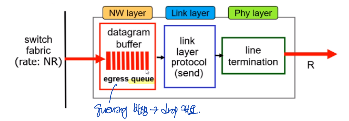 : Switching fabric에서 수신된 패킷을 저장하고, 필요한 link layer, physical layer 기능을 수행하여 output link로 패킷을 전송한다.