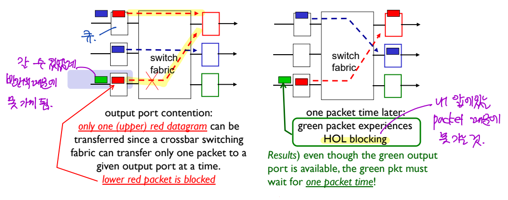 : switching rate가 느리면, input port buffer에 패킷이 늘어난다.