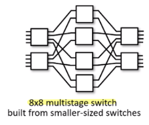 - multistage switch: crossbar의 단점을 극복하여, 한 번에 여러 개의 패킷이 같은 output port로 나갈 수 있도록 하였다. 이와 더불어, 병렬성을 이용해 switching 속도를 높였다.