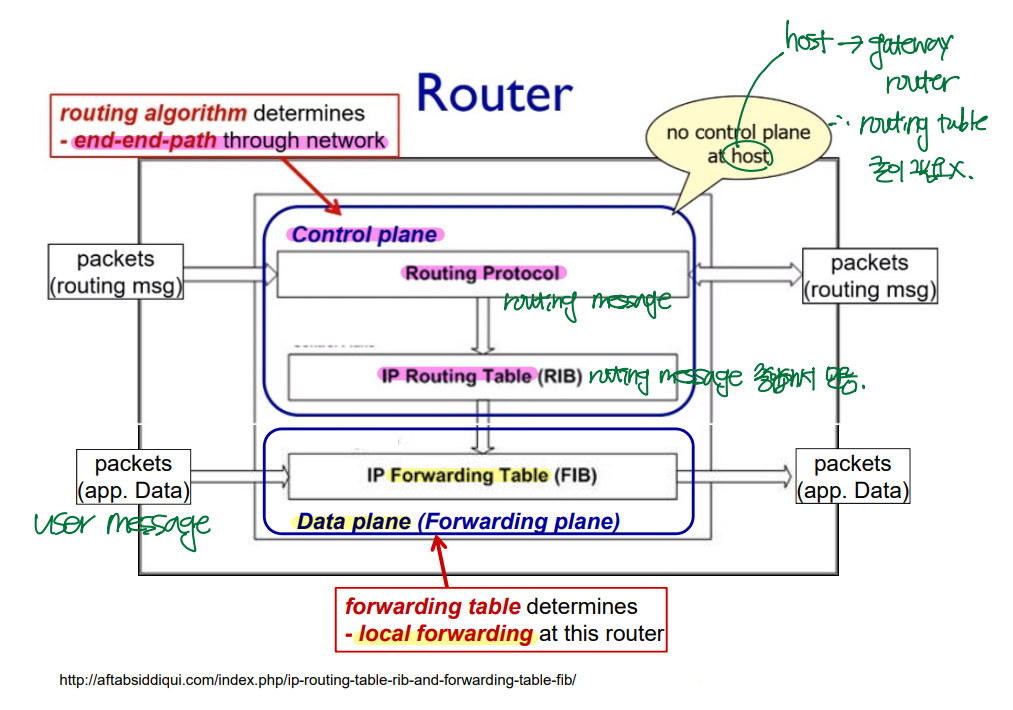 - Control plane에서: routing protocol --> routing algorithm --> routing table