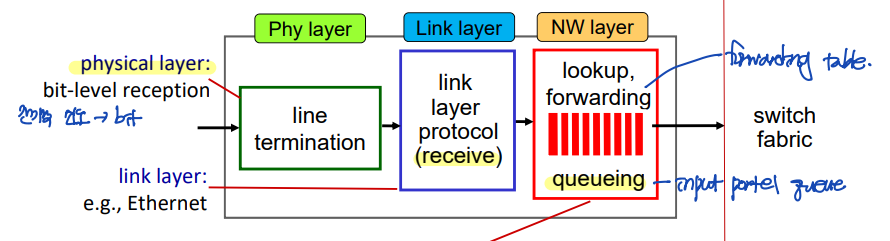 - Link-layer 기능: input port는 들어오는 링크의 반대편에 있는 link-layer과 상호운용하기 위해 필요한 link-layer 기능을 수행한다.
