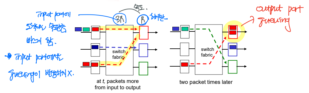 하지만 output port는 다르다. Switching fabric의 corssbar 방식에서의 문제를 해결하여 하나의 서로 다른 input port에서의 패킷을 같은 output port로 전송한다면, output port에는 필연적으로 패킷이 쌓이고, 따라서 queueing이 발생하게 된다.