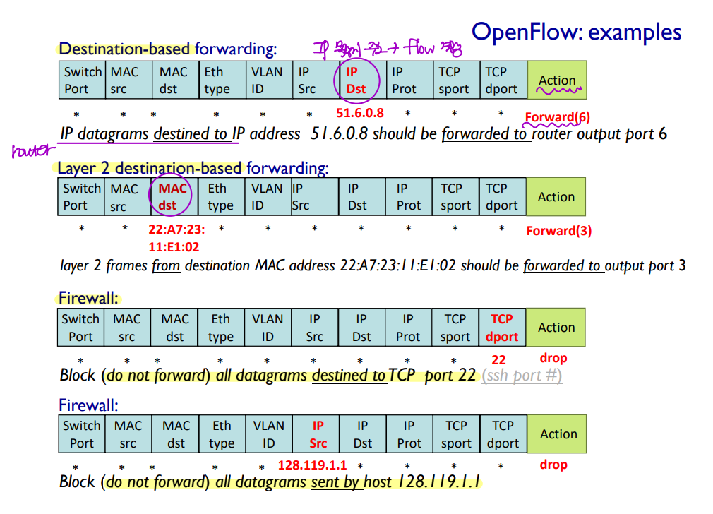 : Flow table은 forwarding table과 달리, 목적지 주소로의 forwarding 외에도 다양한 기능을 수행한다.