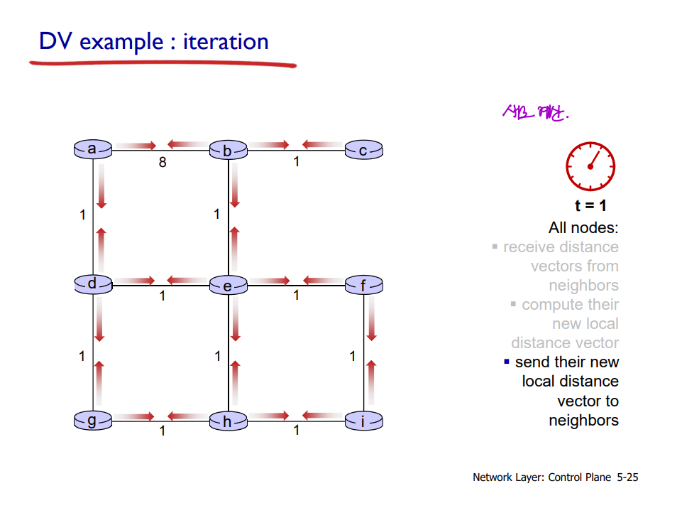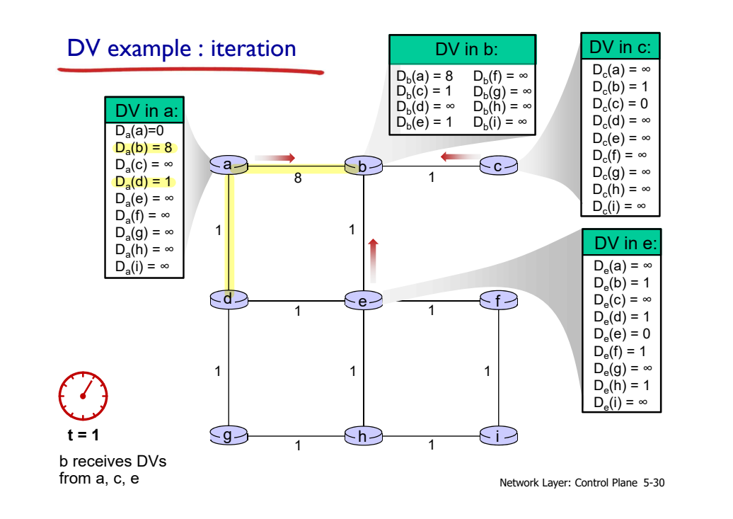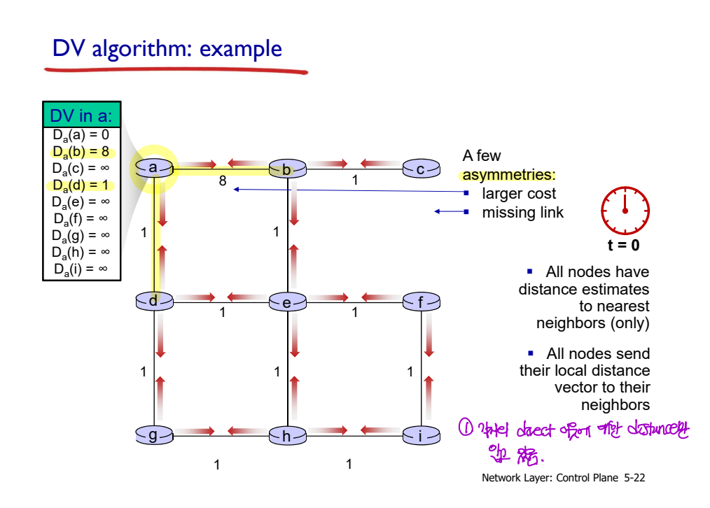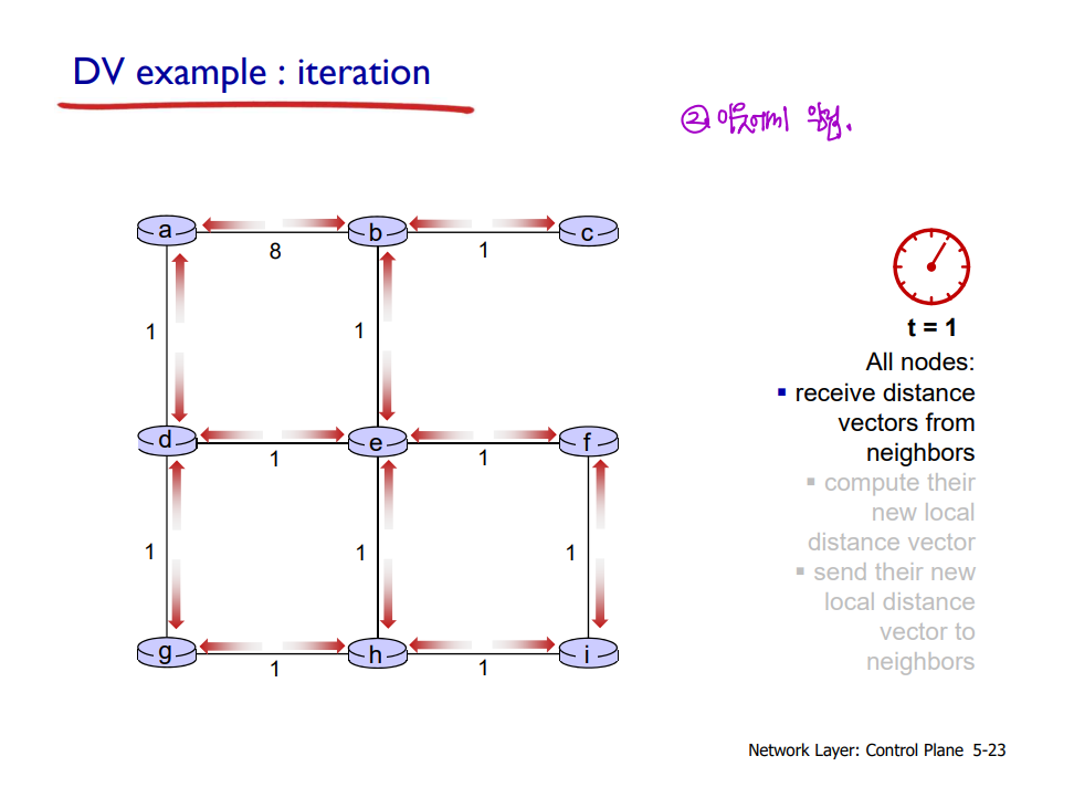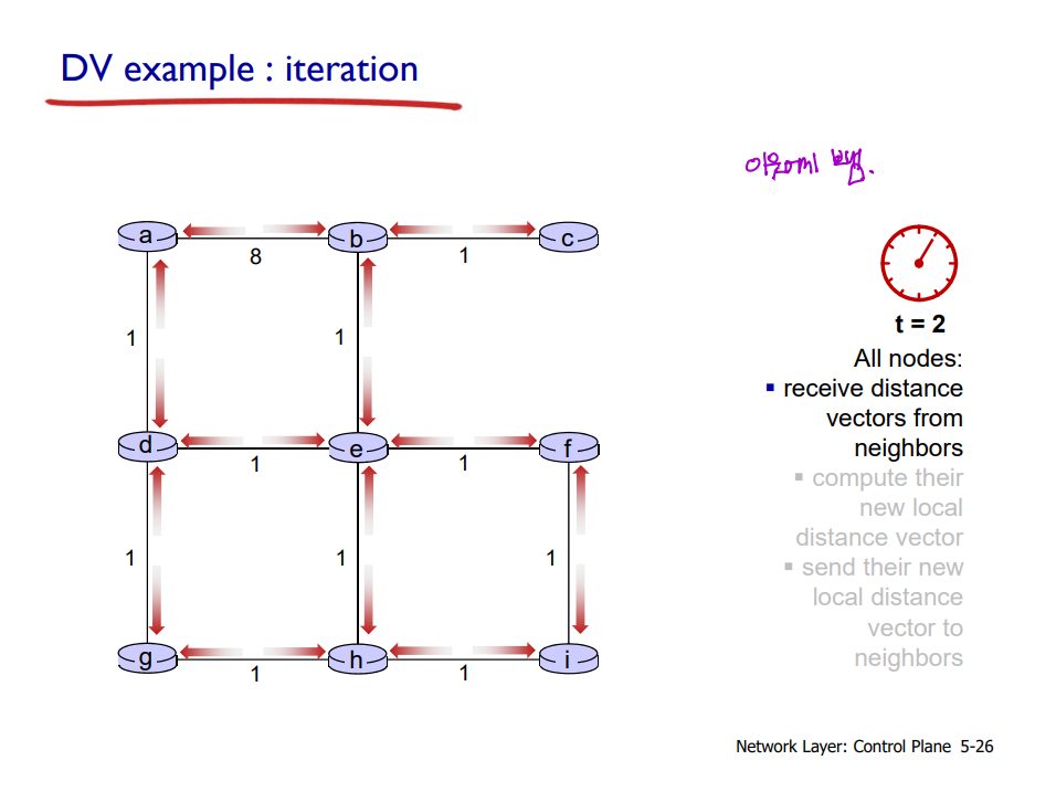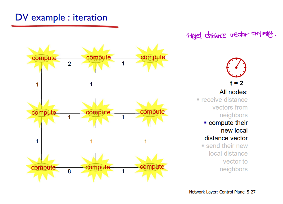 --> 계속 계산하다가, distance vector가 더 이상 변하지 않으면, settle된다.
