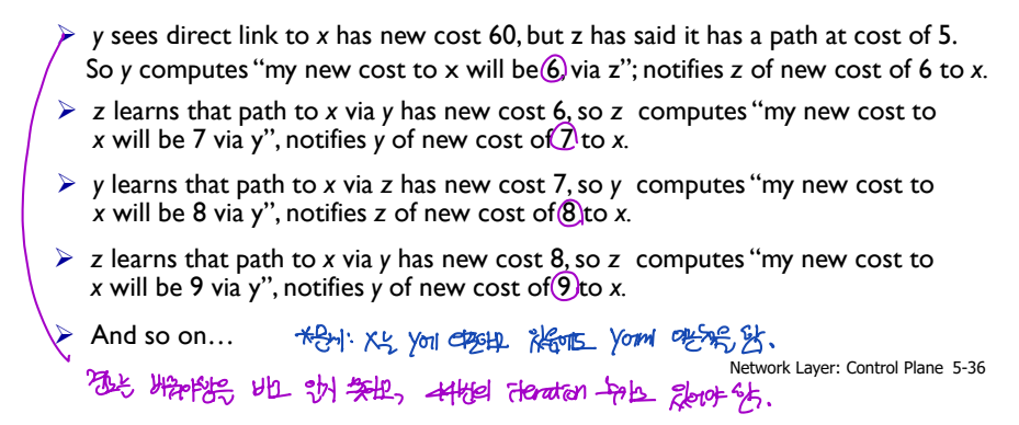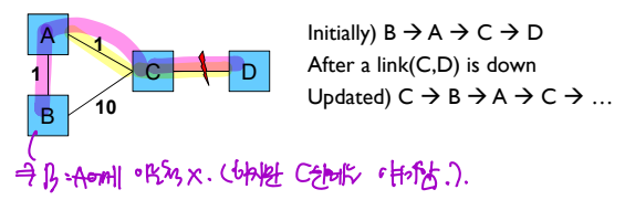 ▶ Count to infinity: 기존 경로가 나빠졌을 때는 바꿔야 할 경로를 알아차리는 데에 시간이 오래걸린다.