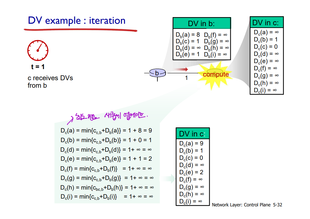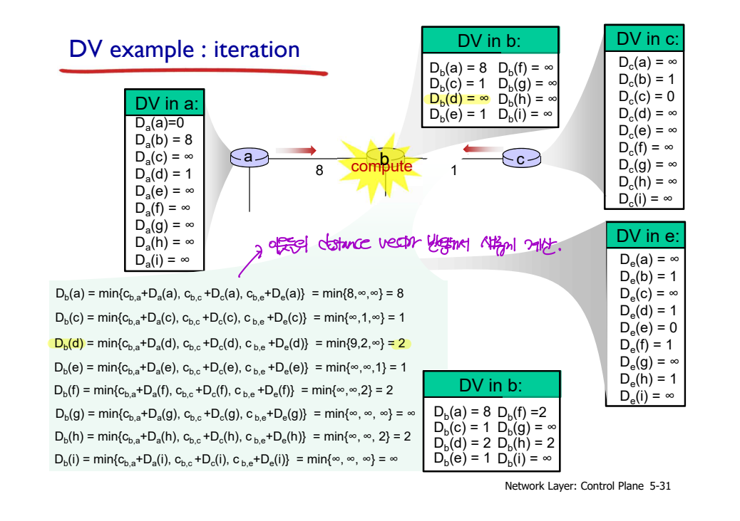 - 원래 경로보다 더 좋은 경로가 나타났다! Distance vector를 업데이트한다!