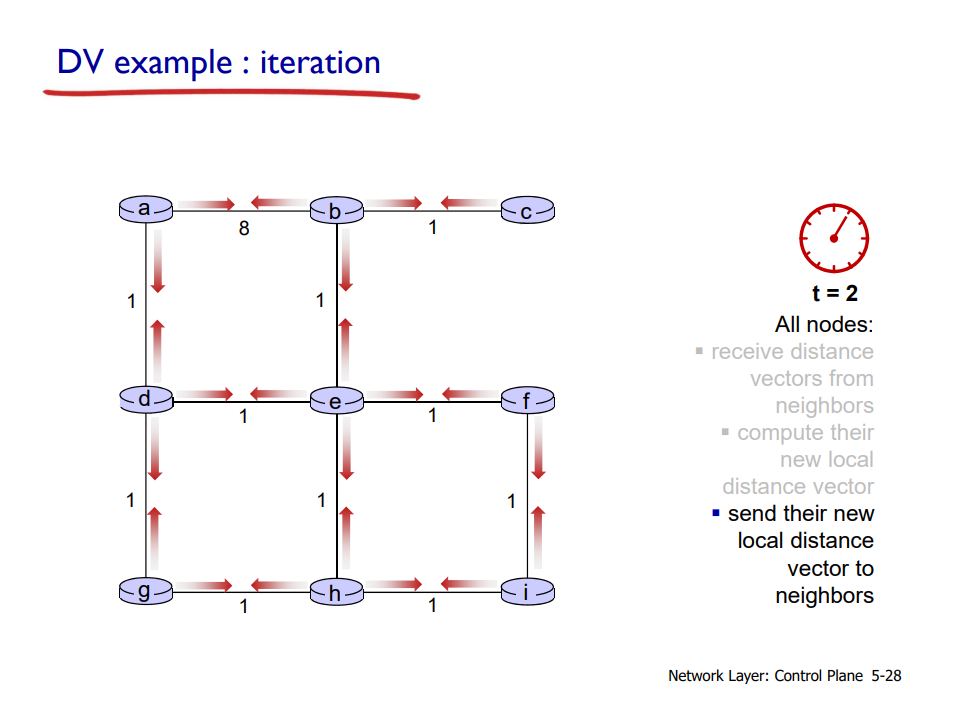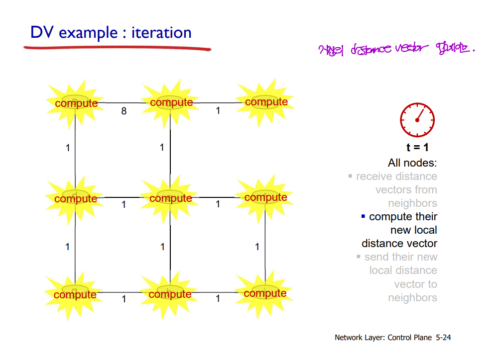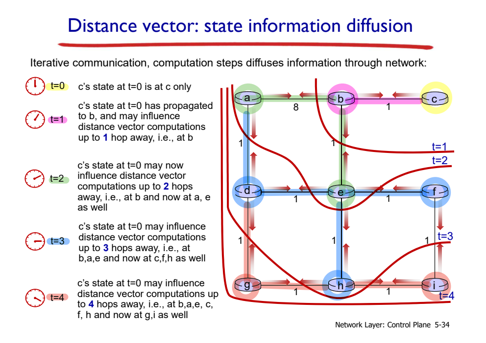 - 계산한 결과 어떤 목적지로의 distance vector가 변하면, 이웃에게 알린다.