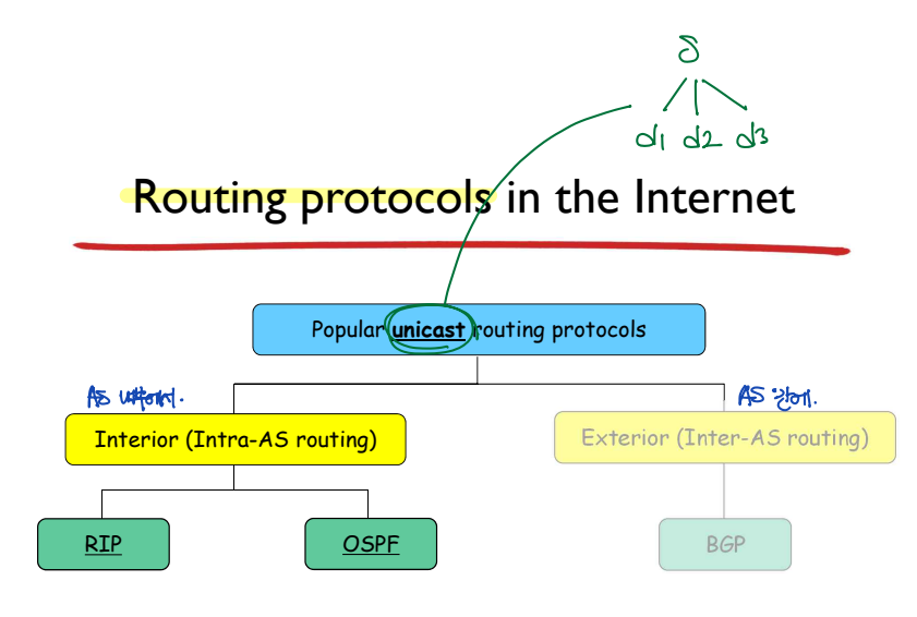 - Intra-AS routing: 하나의 AS 내에서 destination을 결정한다. (Intra-AS routing protocol --> Forwarding table)