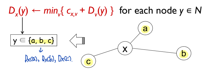 Dx(y) = x로부터 y까지의 최단거리를 알기 위해서는 {a, b, c} 중 어떤 node를 거쳐야 하는지 알아야 한다.