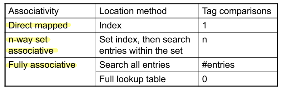 - Hardware caches: 하나의 set에 대해 여러 데이터를 저장할 수 있어 miss rate가 낮아지지만, comparison time이 늘어난다.