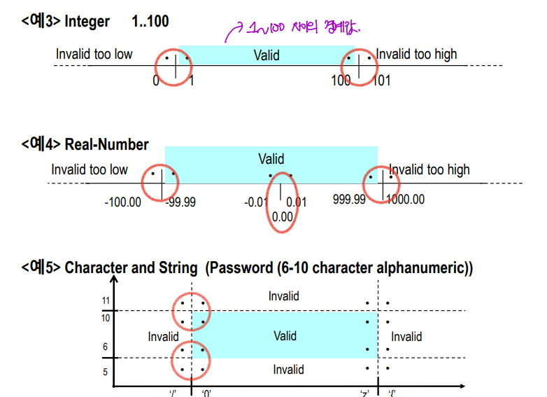 예3) valid, invalid로 동치분할 후, valid 경계에서 1, 100을 테스트 입력으로 선정된다.