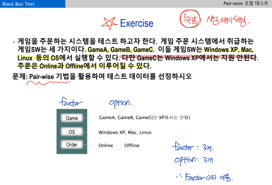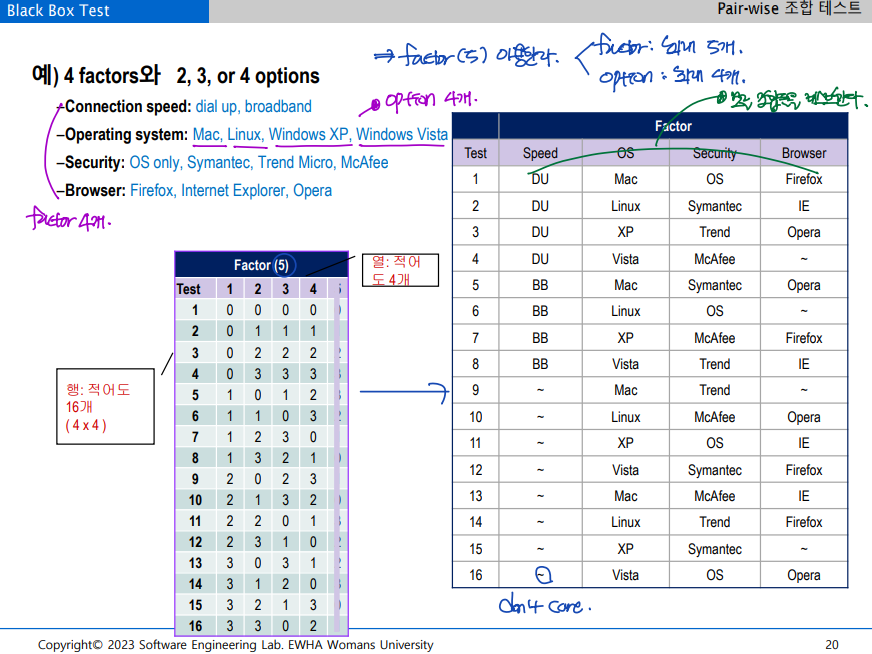 : 2개 요소의 상호작용에 의한 테스트가 결함을 보다 더 잘 발견한다는 경험에 기반한 테스트 방법으로, 테스트 대상 아이템의 모든 요소(factor)에 대하여, 두 개 요소의 모든 조합을 생성한다.