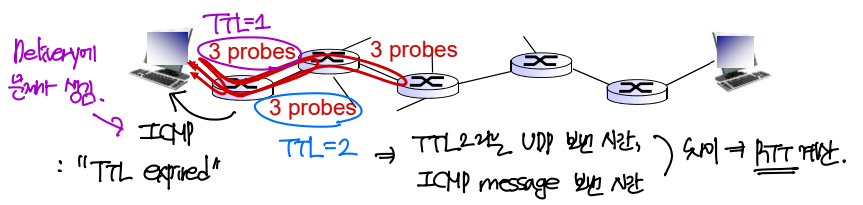 - Source host --> Destination host: UDP segment를 IP datagram에 실어서 보낸다. 이때, TTL = 1, TTL = 2 ... 이런 식으로 TTL을 점점 늘려가면서 보낸다.