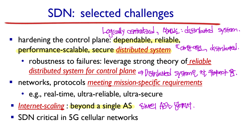 - SDN controller는 logically centralized 시스템이지만, 실제 구현은 distributed system이다.