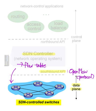 - SDN controller로부터 flow table을 받아오는데, 이때, southbound API를 통해 소통한다. southbound API의 대표적 예시로 OpenFlow protocol이 있다.