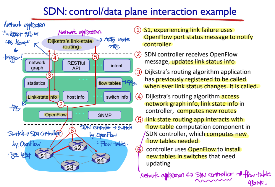 - Network-control application은 "~~~ 변화가 있을 때 나를 불러라."라는 메시지를 미리 저장해두었다. 새로운 route 계산이 필요하기 때문에, Dijkstra's link-state routing이라는 network-contorl application을 부른다.