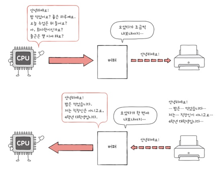 **버퍼링(buffering): 전송률이 높은 장치와 낮은 장치 사이에 주고받는 데이터를 버퍼(buffer)라는 임시 저장 공간에 저장하여, 전송률을 비슷하게 맞추는 방법이다. 즉, 버퍼에 데이터를 조금씩 모았다가 한꺼버내 내보내거나, 데이터를 한 번에 많이 받아 조금씩 내보내는 방법이다.