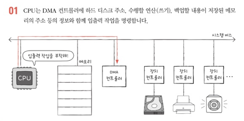 - DMA controller --> CPU: 입출력 작업이 끝나면, DMA controller는 CPU에 인터럽트를 걸어, 작업이 끝났음을 알린다.