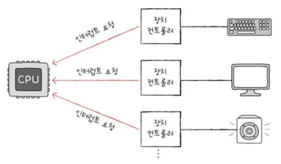 : I/O device에 의한 하드웨어 인터럽트는 device controller에 의해 발생한다. CPU는 device controller에게 입출력 작업을 명령하고, device controller가 I/O device를 제어하며 입출력을 수행하는 동안, 다른 일을 할 수 있다.