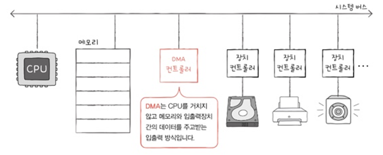 - DMA controller: DMA 입출력을 하기 위해서는 시스템 버스에 연결된 DMA 컨트롤러라는 하드웨어가 필요하다.