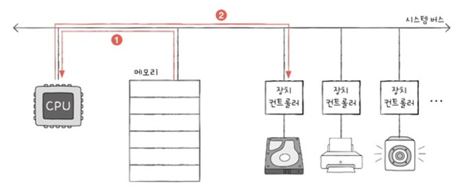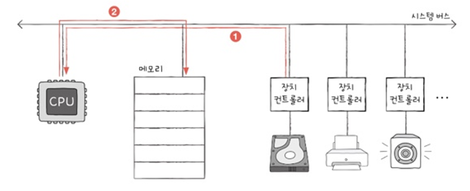 즉, 메모리 -- CPU(register) -- device controller -- I/O device: CPU가 항상 개입된다!