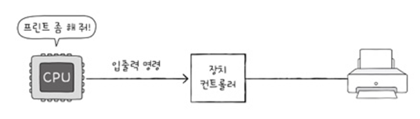 - CPU가 프로그램 속 명령어를 실행하는 과정에서 입출력 명령어를 만나면, CPU는 I/O device에 연결된 device controller와 상호작용하며 입출력 작업을 수행한다.