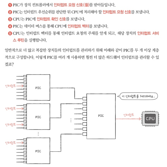 - PIC(Programmable Interrupt Controller): 우선순위를 반영하여 다중 인터럽트를 처리하는 방법