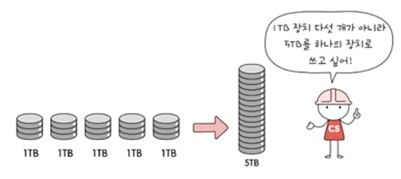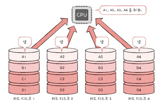- 하나의 대용량 저장 장치를 이용했더라면 여러 번에 걸쳐 읽고 썼을 데이터를 동시에 읽고 쓸 수 있다.