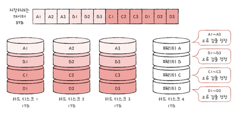: RAID 1처럼 완전한 복사본을 만드는 대신, 오류를 검출하고 복구하기 위한 정볼르 저장한 장치를 두는 구성 방식
