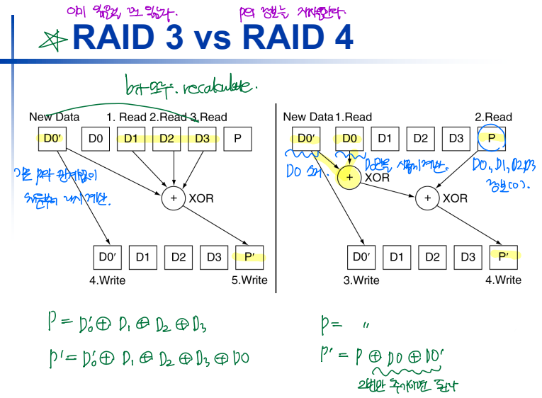 --> RAID 3 vs. RAID 4: Parity를 계산하는 방식에서 차이가 있다.